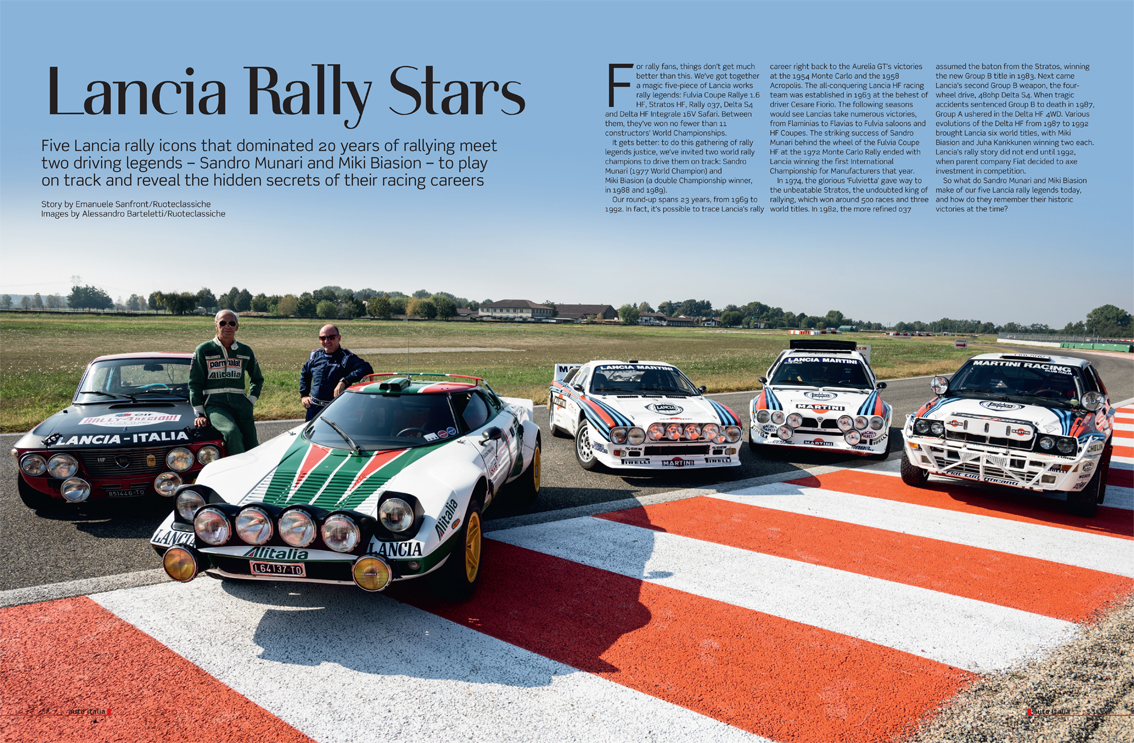 It’s not often you’re able to gather five Lancia works rally legends together, let alone match them up with two world champion rally drivers. So it’s a great privilege to bring you a track test of five dominant Lancia rally cars representing a 23-year period of epic greatness – Fulvia, Stratos, 037, Delta S4 and integrale – all presided over by ex-world champions Sandro Munari and Miki Biasion. The memories are golden and the cars are true stars. Together with a head-to-head featuring the fabulous Alfa 2600 Spider and Lancia Flaminia Convertible, we reckon this is a classic issue!