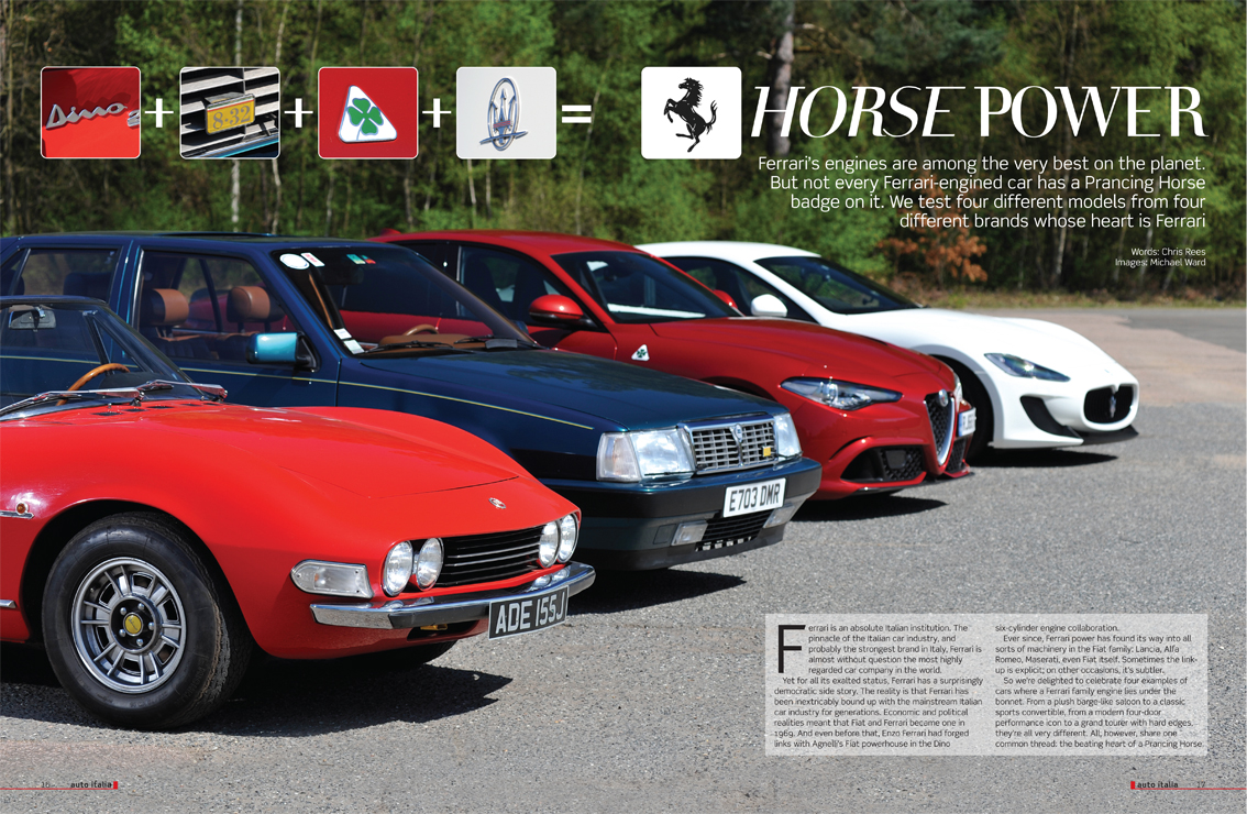 FERRARI POWER GROUP TEST – Four non-Ferraris with Ferrari family engines: Alfa Giulia QV, Lancia 8.32, Maserati GT & Fiat Dino