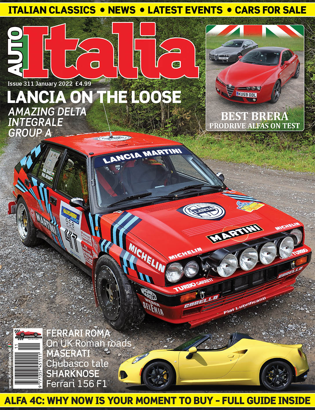 Our cover story this month is a very special Lancia Delta integrale: a Group A rally car so good that it deeply impressed the Italians at the recent Rallylegend event. Two modern classics from Alfa Romeo also feature: the Brera Prodrive S (both 2.2 and 3.2 V6 versions) and the much misunderstood 4C, about which we have a full buying guide. One of the most iconic classic Ferraris – the 156 ‘Sharknose’ F1 car – is joined this month by a UK drive in a very modern Prancing Horse, the Roma. Lamborghini has celebrated the 50th anniversary of the Countach by recreating the original 1971 LP 500 – we have the full story – and you can also read all you’ll ever need to know about Gandini’s extraordinary Maserati Chubasco prototype. Fiat fans will revel in a ‘gravel test’ in a genuine works Stilo Abarth Trofeo, while we have full reports on our Brooklands Italian Car Day and a drive in an Alfa SZ to the Italian Alps. Fun? For sure!